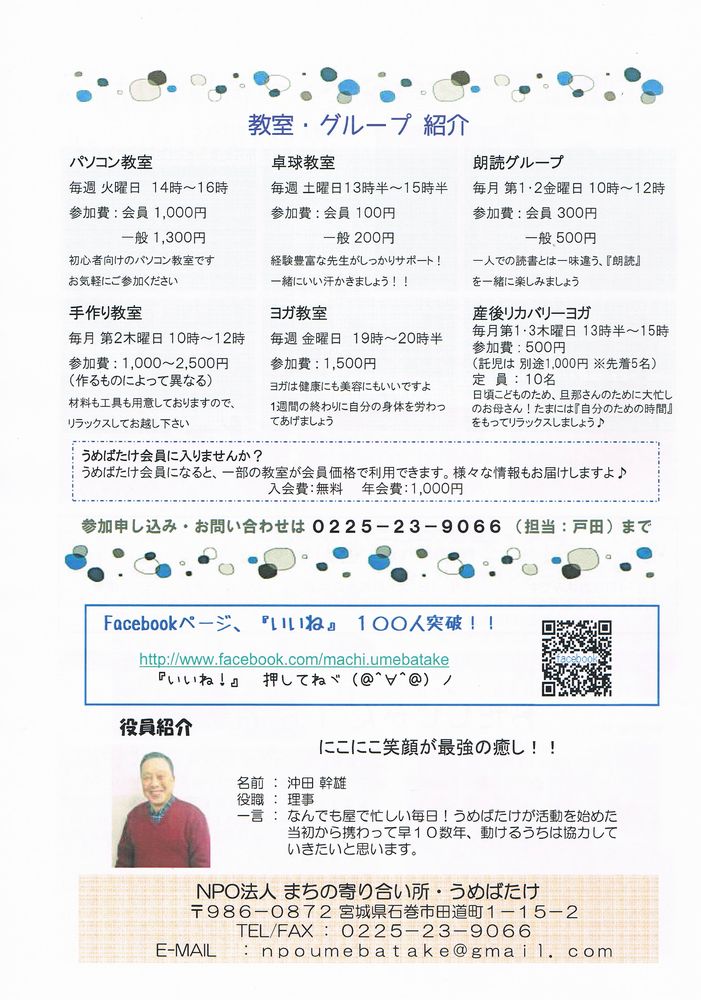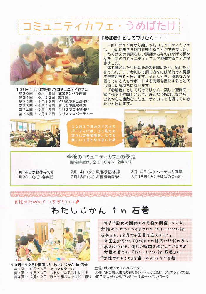 2014年1月21日 / 最終更新日 : 2014年3月14日 toshio その他 うめばたけ新聞冬号 うめばたけ新聞・冬号が発行されました。今年10月〜12月の3か月間に行われたイベントや教室などのニュースや写真が 掲載されているので、ご 覧ください。なお、事務所にコピー(白黒)がありますので、必要な方はお寄りください。 (ページ写真をクリックすると拡大します) 1ページ 2ページ 3ページ 4ページ Facebooktwitter コメントを残す コメントをキャンセル