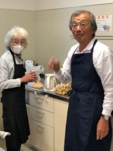6月25日(木) おにぎり・シアターAct.24 が開催されました。今回はコロナ対策として3月初めより休館・休止していた「うめばたけ」の活動を、6月より段階的に再開したプログラムの一つです。入館時に手指を消毒し、体温測定・記録。3密(密閉、密集、密接)を避けるため、市販のおにぎりを用意し、「味噌汁づくり・ボランティア」は神室清孝さん。具は神室さん自家製のじゃが芋、玉ねぎ、にんじんと油揚げ。それに、蒸かした新じゃが1個が添えられて食事スタート。