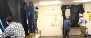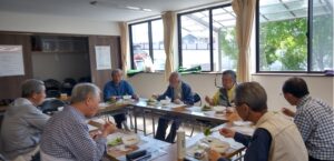 5月23日(木) おにぎり・シアターAct.65が 開催された。「味噌汁づくりボランティアは菊池さん。参加予定のメンバーが急用のため、急遽ピンチヒッターで担当 \(^o^)/、具材は:豆腐、油揚げ、茄子、玉ねぎ、人参のオーソドックス味噌汁。それに、神室さん差し入れの茹で玉ねぎ、漬物、サラダ菜などに市販のおにぎり、肉団子で黙食。