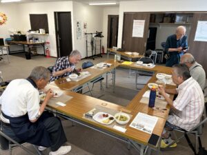「石巻河北(河北新報の子会社)からの依頼を受け、前谷地の龍口神社の歴史などについて新聞販売店と一緒に神社の宮司や関係者から聞き取りを行なった。その結果が7月31日に掲載される予定」「6月に熱海に行き、十国峠から富士山を眺め、帰りに横浜中華街、東京二重橋へ寄ってきた」「毎日夕方1時間の散歩を欠かさず行い、あとはテレビ当番している」「誘われてコンサートへ行ったり、たまにボランティアで手伝いをしている」「男性だけの”おにぎりシアター”に特別参加させてもらい感謝している」「地域福祉コーディネーターは、地域の課題解決に向け、支援をつなぎ地域活動の活性化を図ること。(歩くなんでも窓口)です!」「先日、人間ドックを受けてきた。従来、有料の(任意検診)である人間ドックは、病院で特別な対応を受けてきたと思うが、最近は一般患者と同じような対応である。人間ドック受診者数が頭打ちなのか?気になる」「先月、我が家の畑にカモシカが現れた!大型の犬かと思ったが・・・警察に連絡したら早速駆けつけてくれたが、その後の足取りは分かっていない」「畑の土がじゃがい適しているようでいるようで、親の代から地域のお祭りの際、頼まれて特別献上している」「中学からの同級生:斎藤さんは演歌・歌謡曲、自分はクラシックのファンだったが、いつからか一緒にコンサートに行くようになって、今は両方のジャンルの音楽を毎月のように仙台や石巻で楽しんでいる」「長年いわゆる”布団“派で過ごしてきたが、腰痛が進み、起床時の動作が苦痛になったので、5月にベッドを購入した。夜中のトイレも苦にならなくなった」「現在、おにぎり・シアター参加登録者は11名であるが、メンバーの体調不良や家族の都合などで毎回の参加者が少なくなっている。今回から社協の応援を得られるので様子を見たい」などなど盛り上がった。